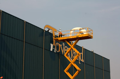 Op bovenstaande foto zien we hoe het nieuwe logo van Toverland wordt aangebracht op de façade van de eerste hal, Het Land van Toos. Alle foto's in deze reeks zijn aanklikbaar voor een grotere weergave. Voor diegene die het nieuwe en het oude logo willen vergelijken, klik