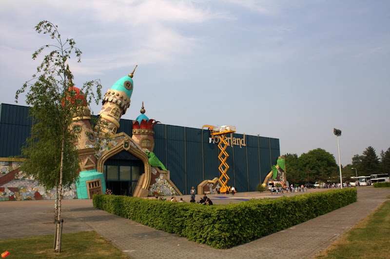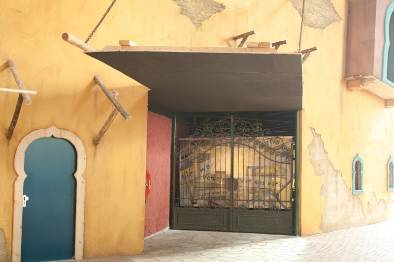Wat we hier zien is o.a. de toegang tot in aanbouw zijnde nieuwe parkwinkel waardoor de bezoekers in de toekomst het park zullen verlaten.