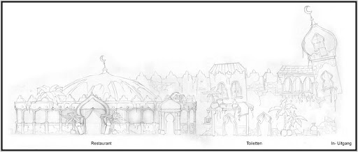 verhaal over het ontstaan van het Land van Toos vinden we geen oosterse elementen terug. Toch denk ik dat, mits goed uitgewerkt, een oosters thema perfect past bij het de ingang van deze hal en het al bestaande Toverhuis. De specifieke torentjes die we terug zien bij deze ingang en bij het Toverhuis zouden dan ook, ietwat 'veroostert', terug kunnen keren in de nieuwe thematisering. Zoals je in het ontwerp kunt zien, had Toverland hetzelfde idee. De meest rechtse toren lijkt qua vormgeving en idee geïnspireerd te zijn op voornamelijk de torens van de ingang, die eveneens op dezelfde manier scheef staan.