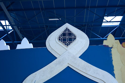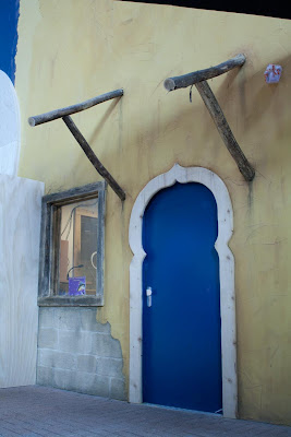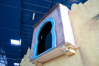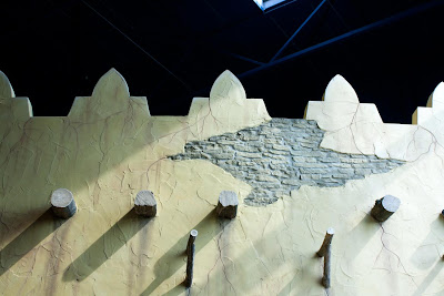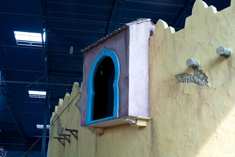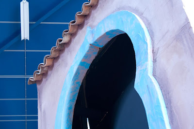 Op bovenstaande foto zien we een nieuwe 'krul' die zich exact boven de ingang tot het Land van Toos bevindt. Ook zien we op deze foto duidelijk de het verschil tussen de oude blauwe muur en de nieuwe muur. Opvallend is overigens dat kantelen die gebruikt worden in de nieuwe muur erg doen denken aan het Troy themagebied.